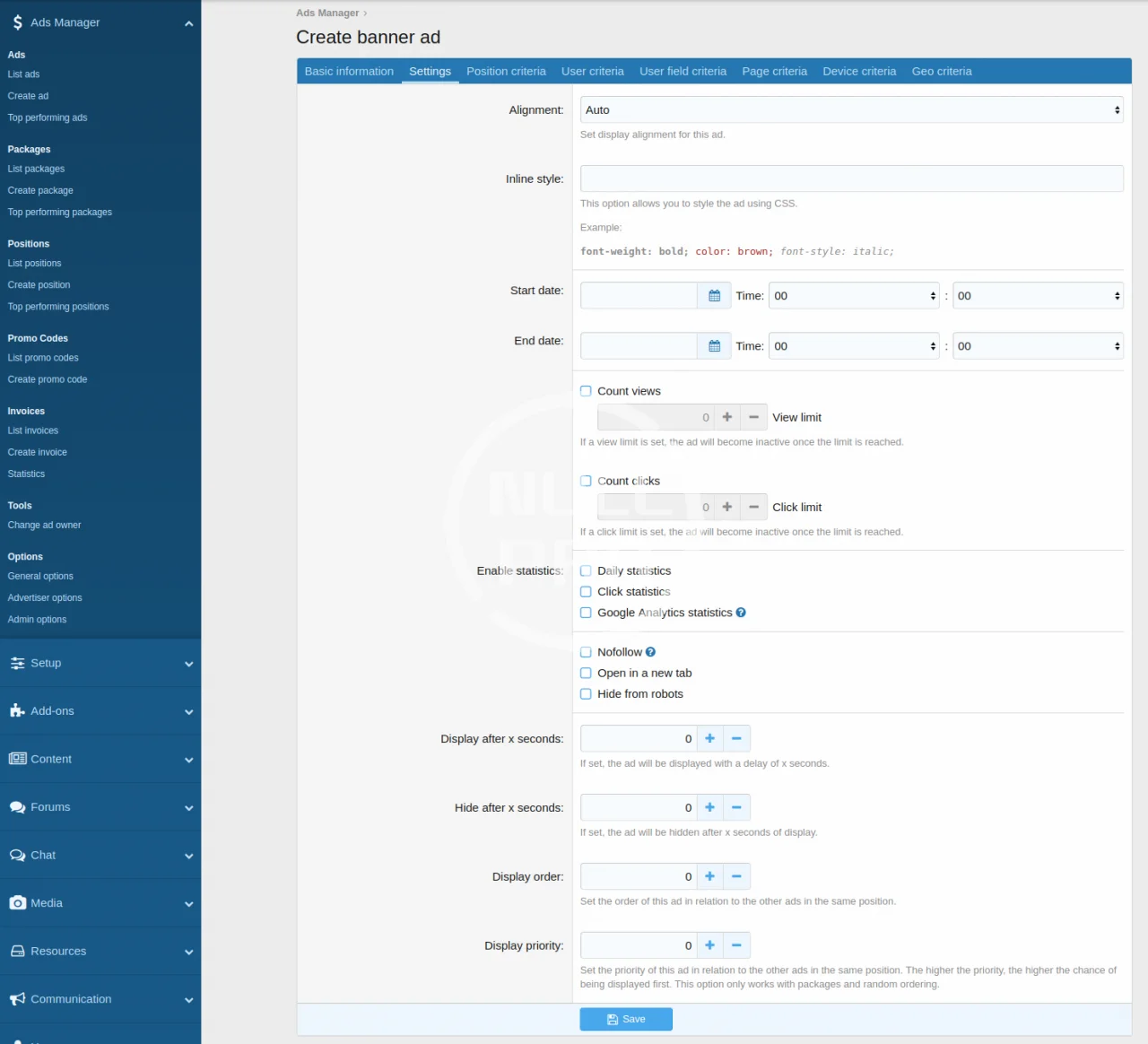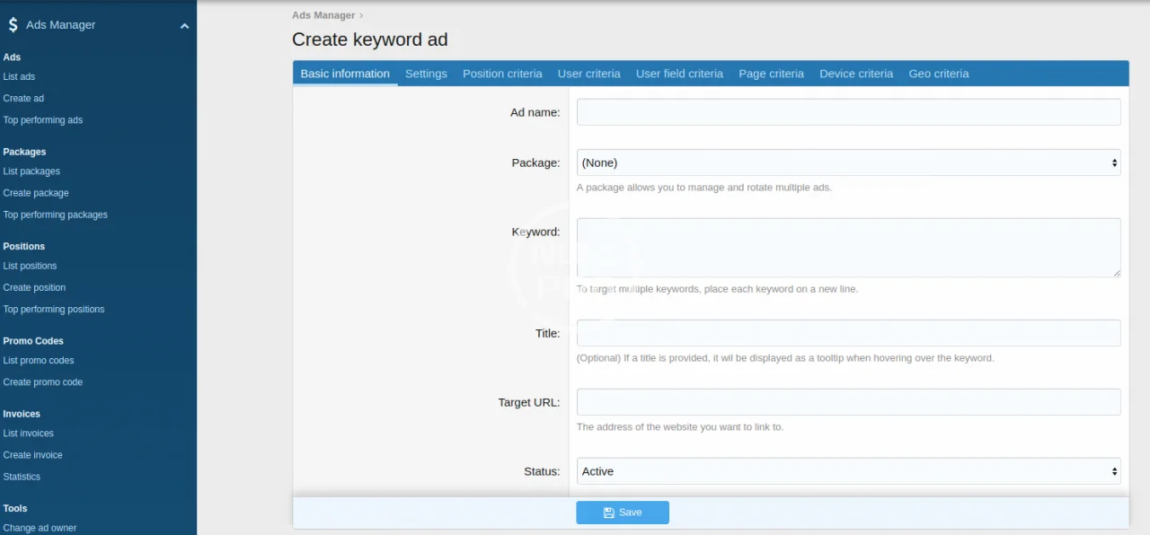 - View detailed statistics for each ad (general, daily, click and Google Analytics statistics)