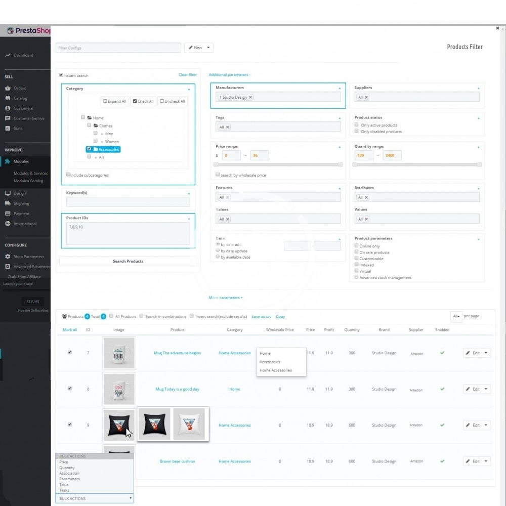 Filter products by category, brands, supplier, keywords, IDs, and +25 products and combinations parameters.