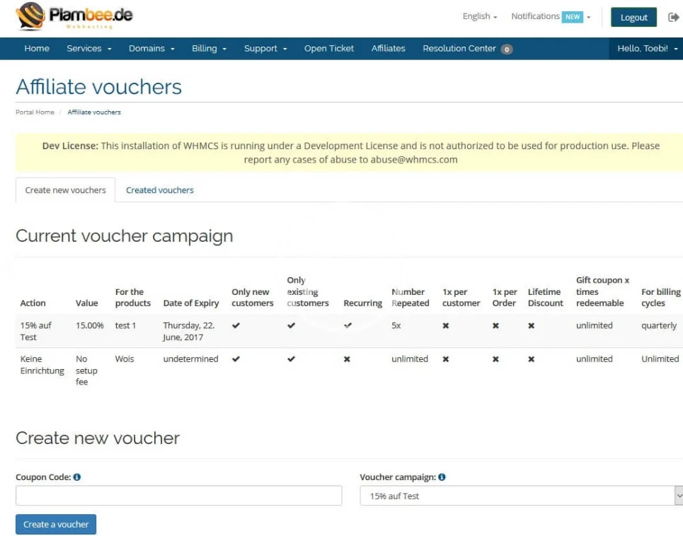 • You define the “Promotion” e.g. 20% on all SSL certificates from supplier XY. In this case, you can decide how long the voucher is valid, the value of how often it can be used, as in the WHMCS’s own “Voucher Generator”.