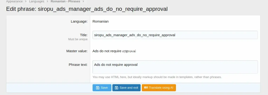 Mass translation page where you can translate phrases for selected add-ons, including XF language packs (Can be found under Appearance > Languages & phrases).