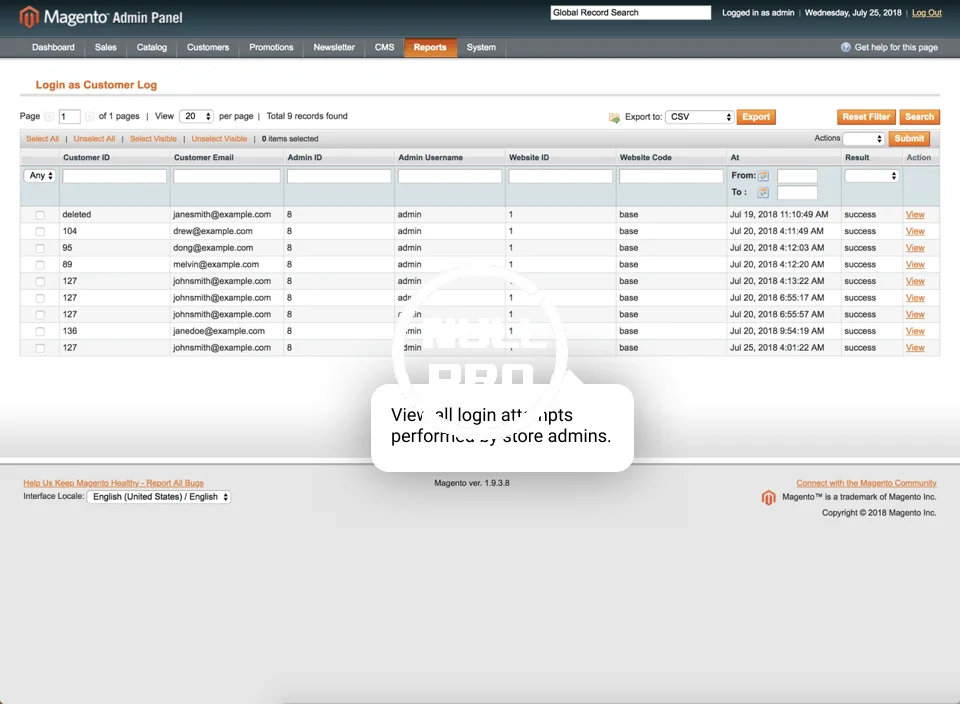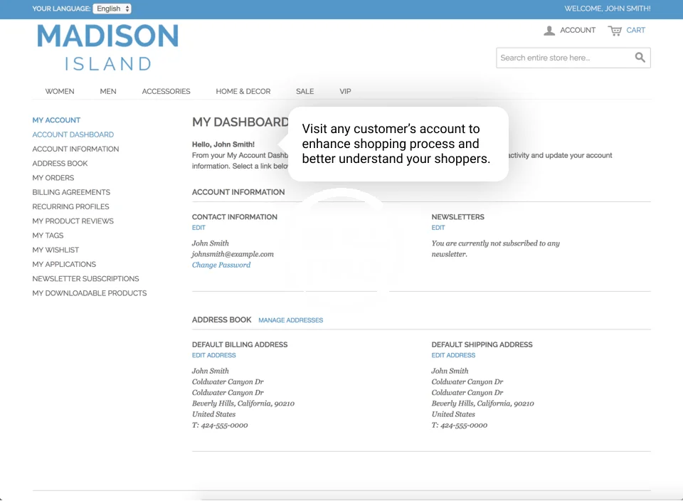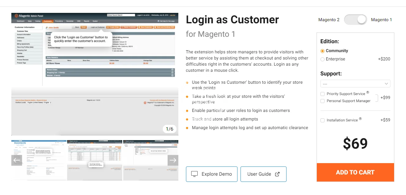 The extension helps store managers to provide visitors with better service by assisting them at checkout and solving other difficulties right in the customers' accounts. Login as any customer in a mouse click.