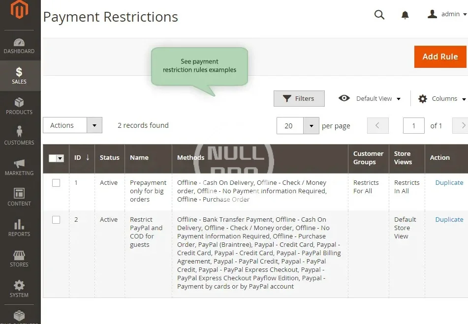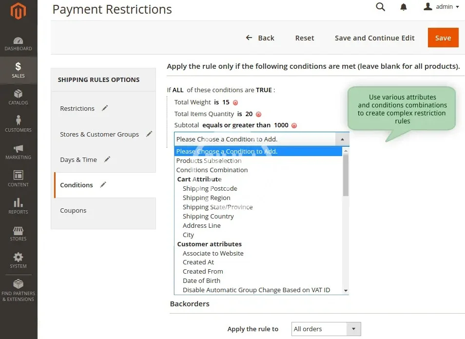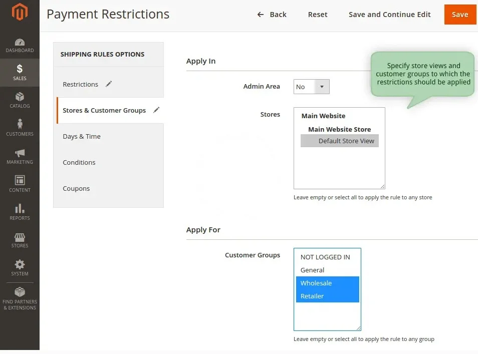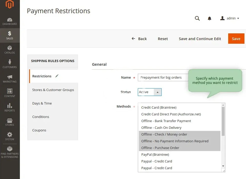 Effectively manage payments in your store. Feel free to restrict payment methods by shipping address, customer groups, store view or product attributes in Magento 2. Restrict cash on delivery, check/money order etc.