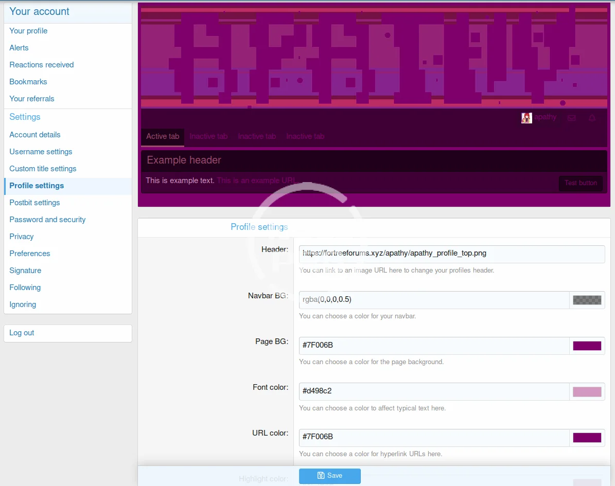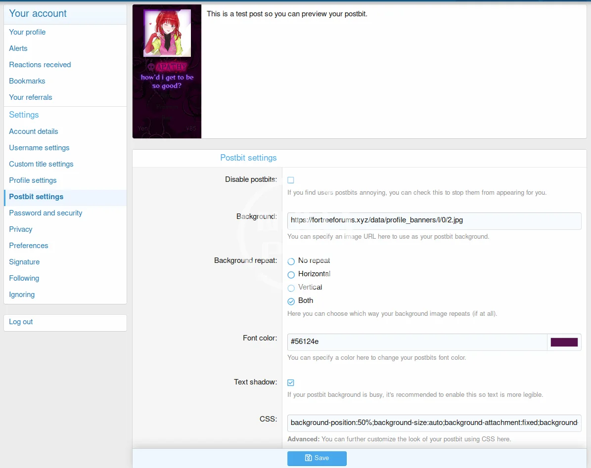 This addon allows users to customize the appearance of the username, custom title, profile, and postbit, by adding 4 new pages to the Account Details section. It also expands upon Account Details by adding a new drop-down field that allows users to add a frame to their avatar.