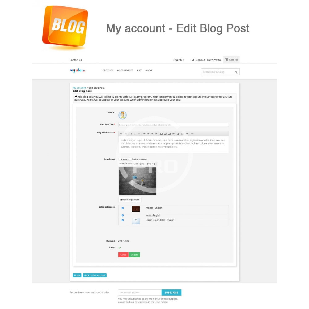 - Customers can add/edit/delete own Blog Posts in the My account -> My Blog posts!