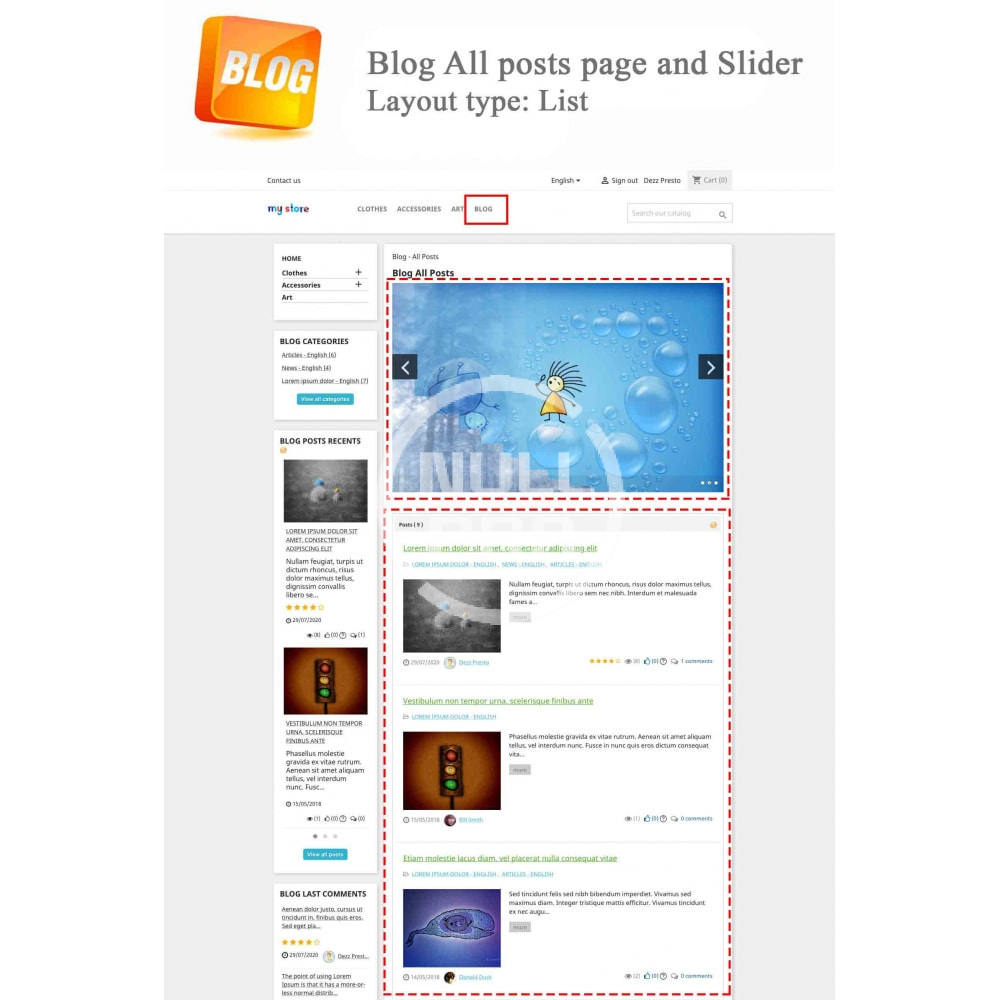 - Blocks settings: "Blog categories" , "Blog Posts recents" , "Blog Posts recents" on the Home Page , "Blog Last Comments" , "Blog Tags" , "Blog Top Authors", "Blog Gallery"