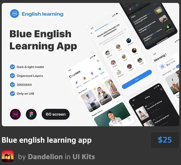 English learning, is a Language learning iOS UI Design Kit for Figma and adobe xd.