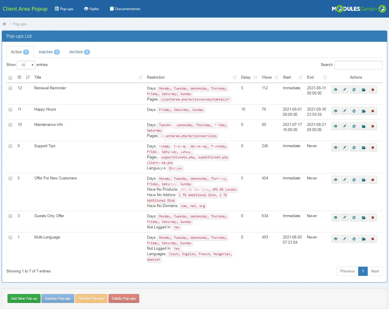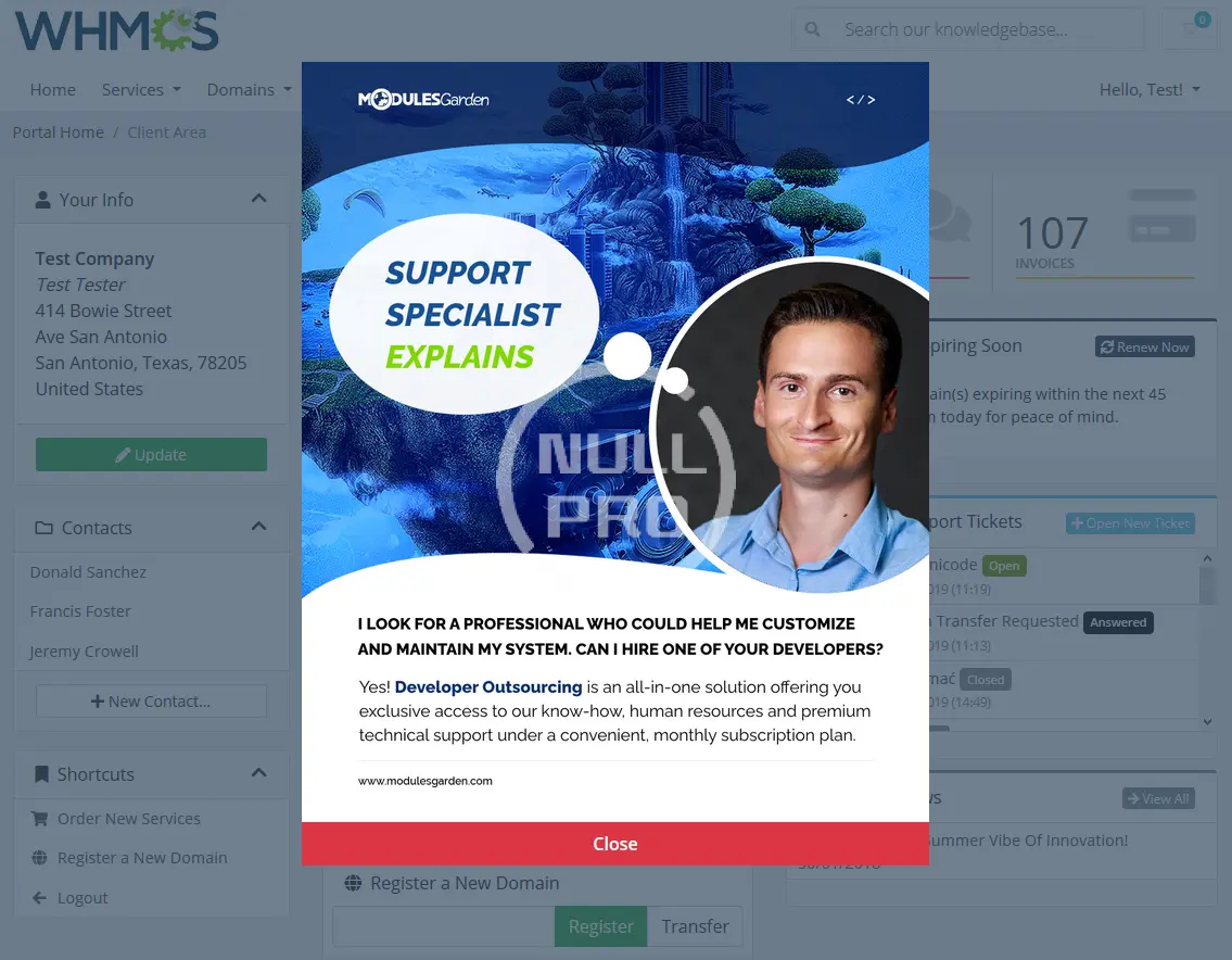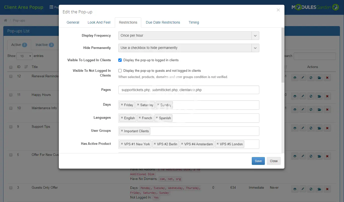 ModulesGarden Client Area Popup For WHMCS is a must-have module that will let you compose customizable pop-ups visible across your client area. You will be allowed to place a series of rules applicable to the appearance, display and the target audience of each notification.