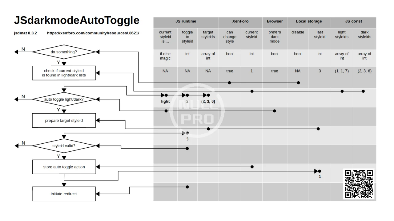 Collecting XenForo data initially, the JS code then checks the current state on load or triggered and initiates a style change via redirection if appropriate. The switch logic is determined by two corresponding lists of light and dark styles to be toggled automatically. All style_id not in list won't be toggled and stay manually chosen.