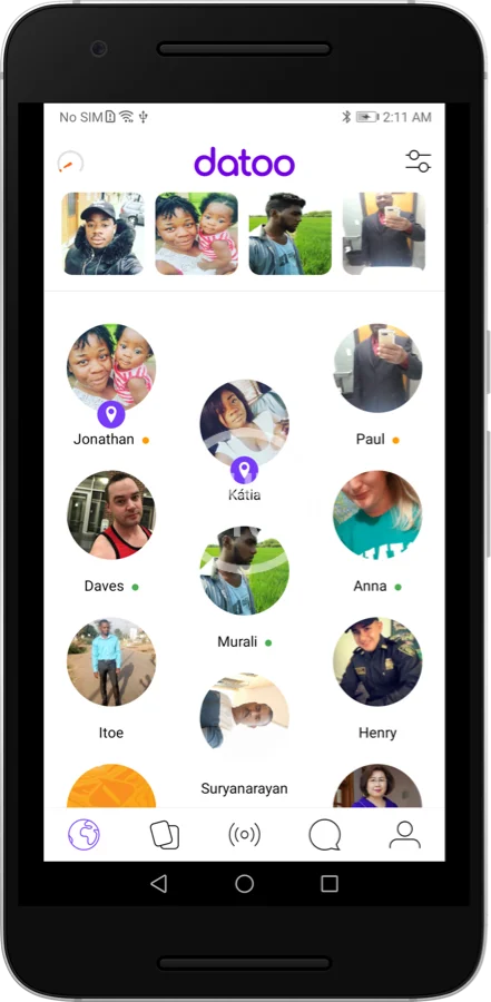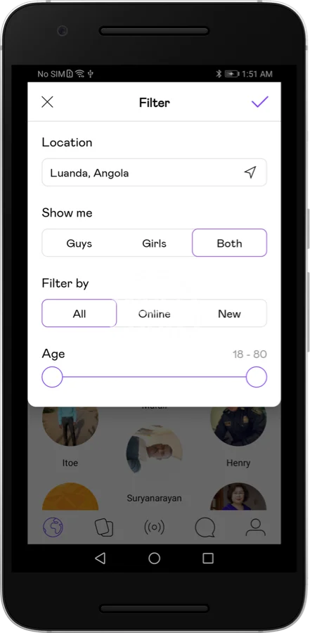 - Filters & Location filter: Filter type of people you want to see, online, age, location etc…