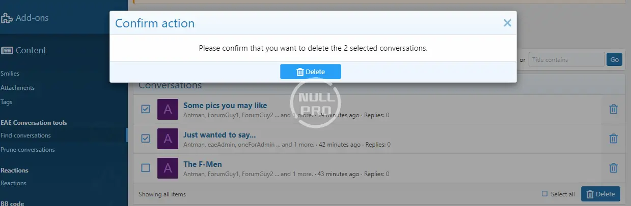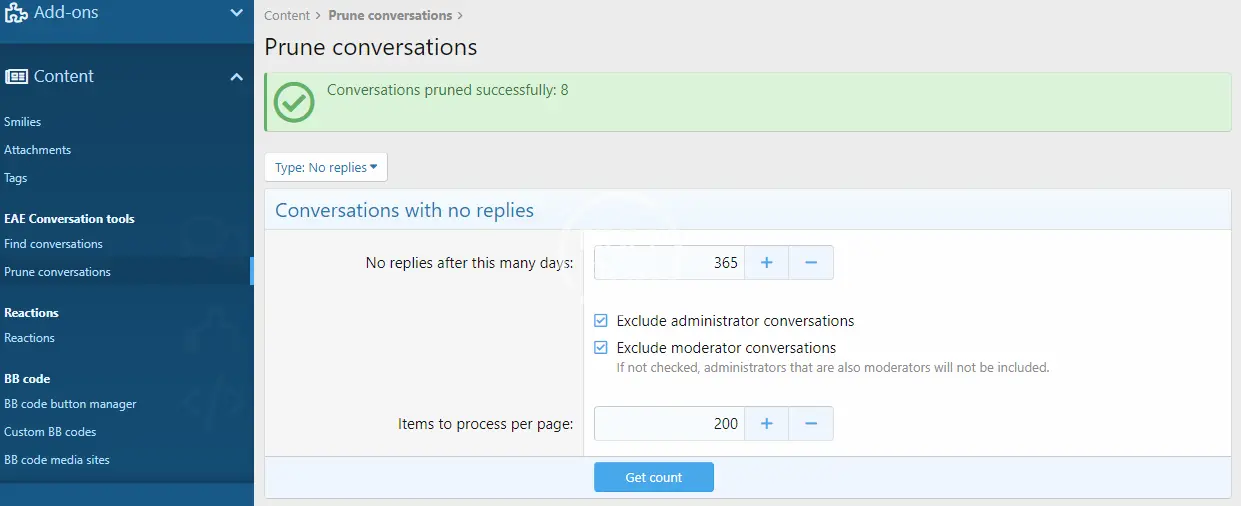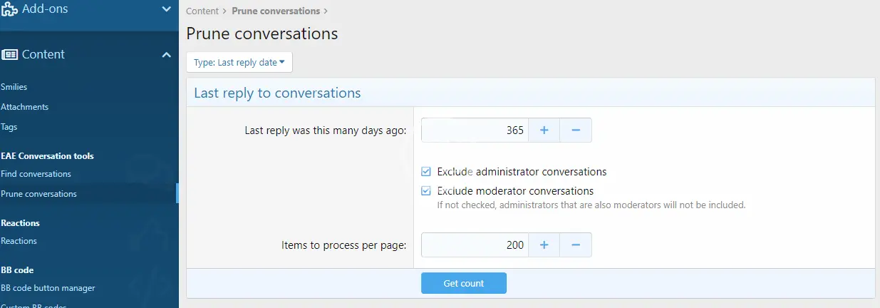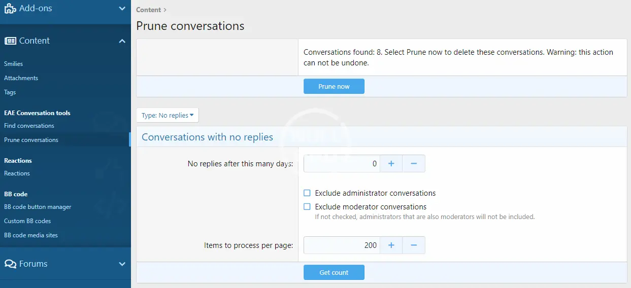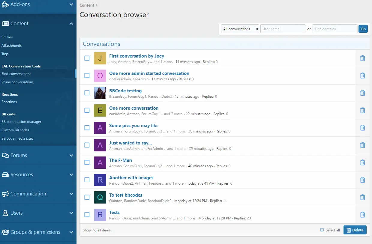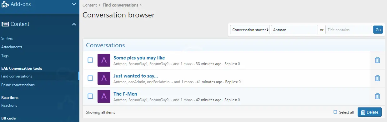 This add-on allows admins with the proper permission to view and delete user conversations and batch prune conversations within the administrator control panel. This add-on is useful in a number of ways: to better understand a reported conversation message as you can follow the flow of the conversation, find old in-active conversations that are just taking up space, or to find and remove spam conversations, to name a few.