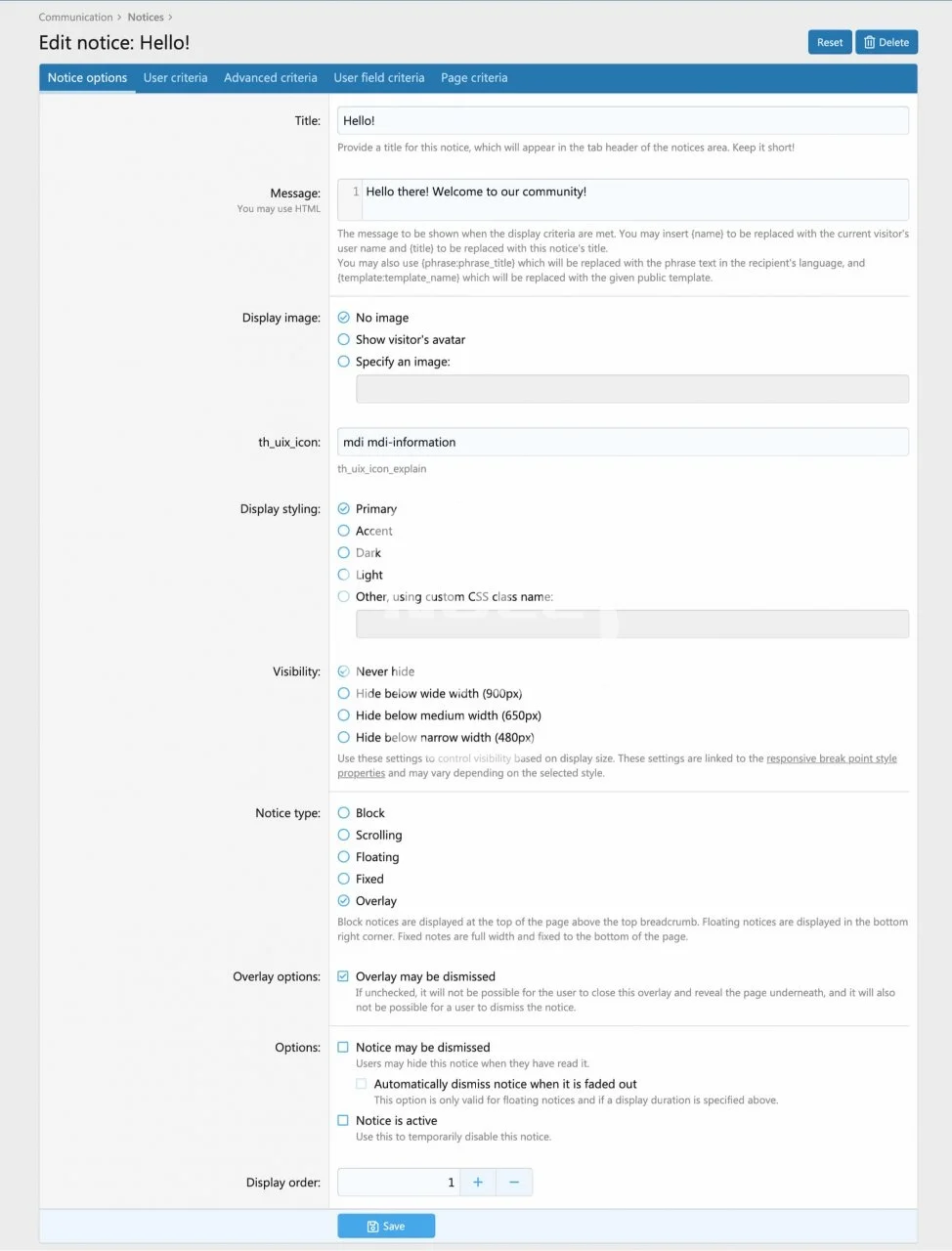 - Turn your notices into overlays with an “overlay” display location and share information