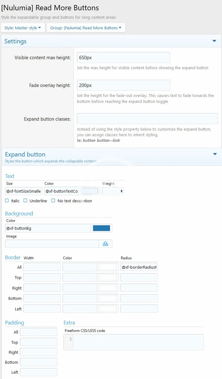 A: After install, go to Admin -> Options -> [Nulumia] Read More Buttons for settings and permissions