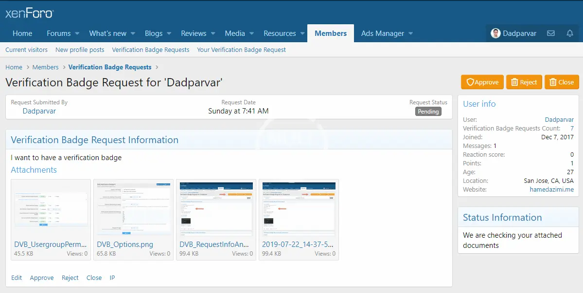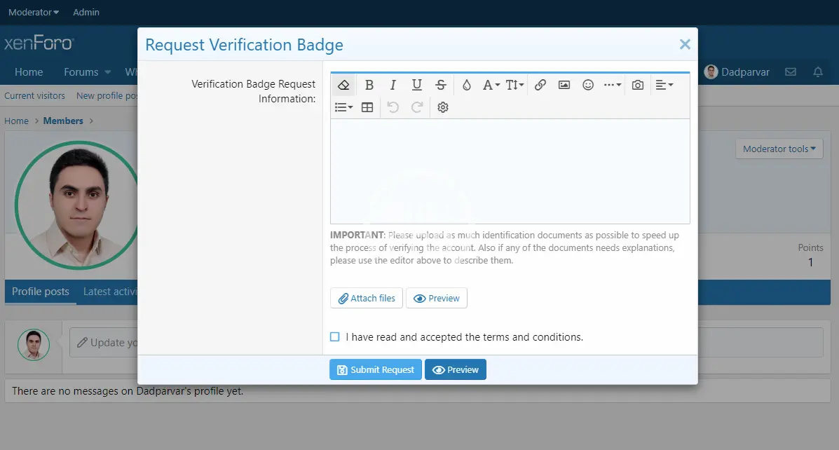 - Users can write a comment and attach files while requesting verification badge
