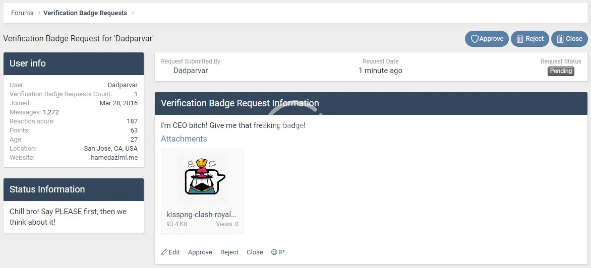 - User's account info/details in request page ("Verification Badge Requests Count" will also show user's all requests)