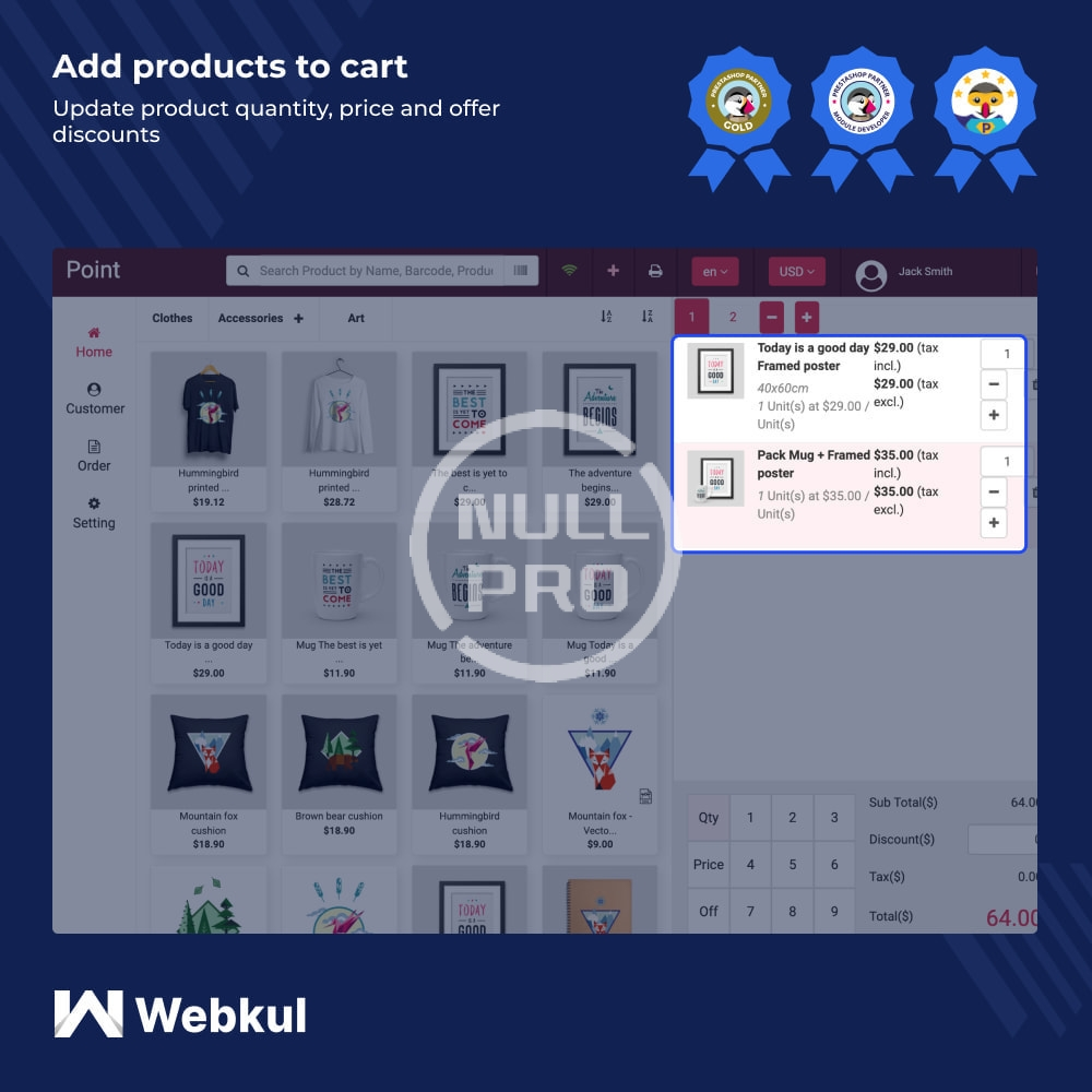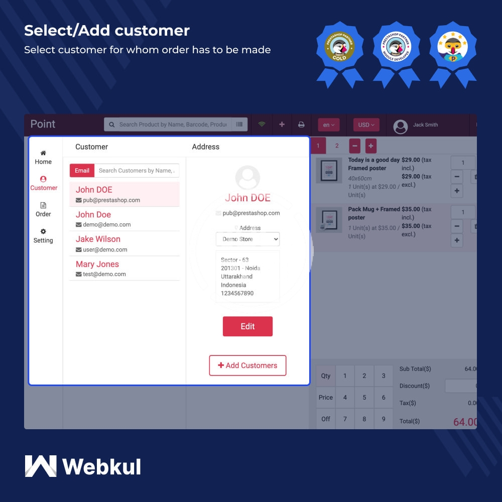 A web-based POS solution to manage multiple physical stores and synchronize them to your online store. Sales agents can search products by scanning barcodes, place orders, manage customers, process offline orders.