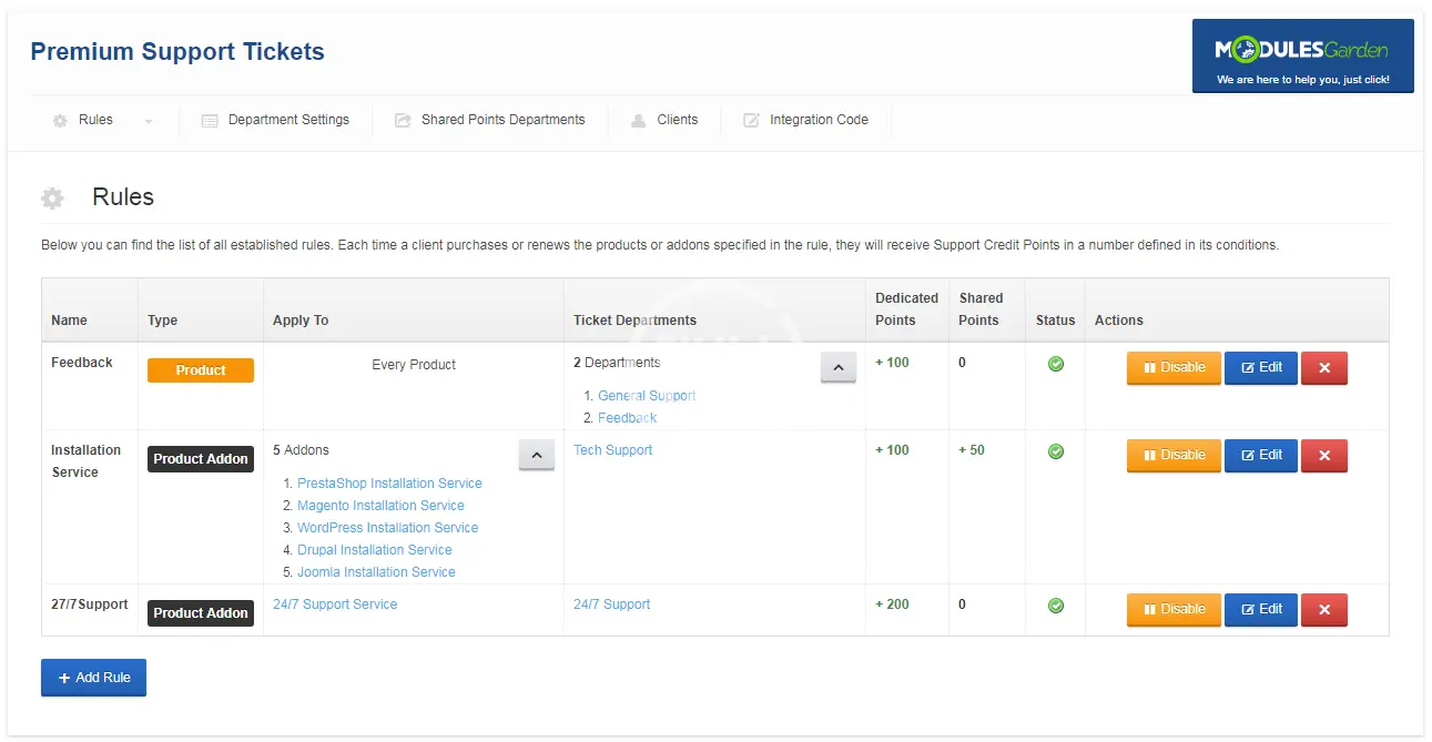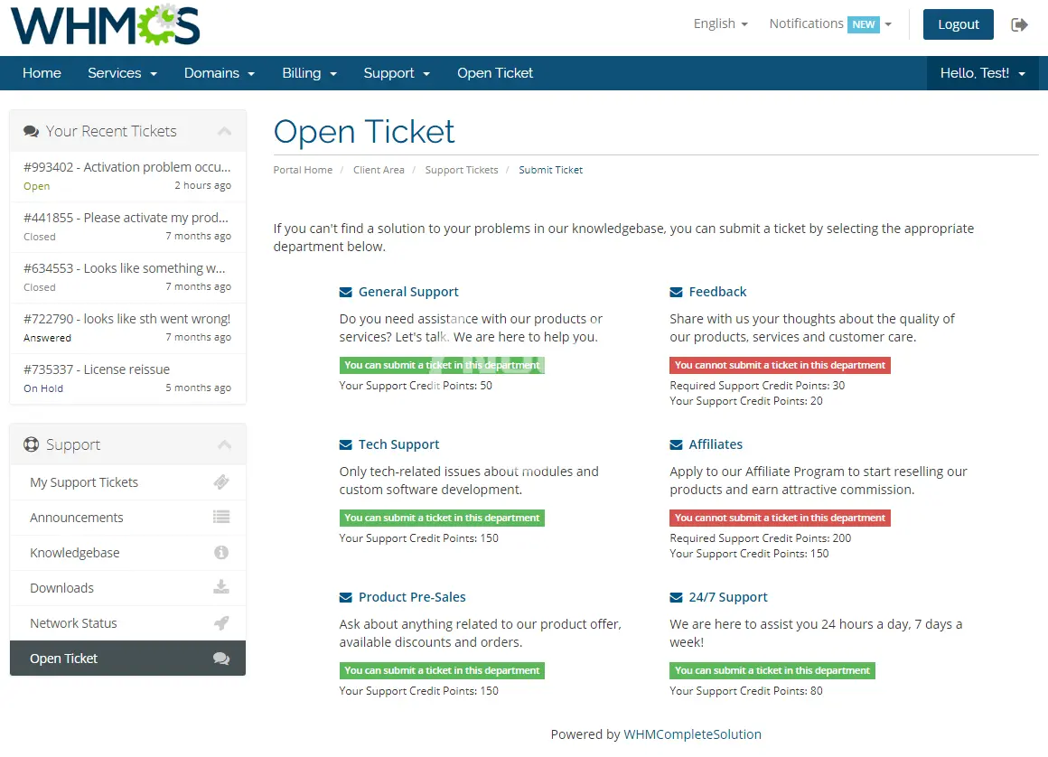 ModulesGarden Premium Support Tickets For WHMCS has been designed to let you supply products and addons defining the scope of access to your support services. With it, your customers will be obliged to purchase support credit points in order to open support tickets in particular departments.