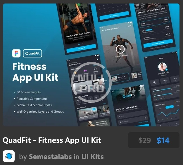QuadFit is a Fitness App UI Kit designed in Figma with a reusable component, auto-layout, text & color styles, and well-organized layers. With 30 screens, components, and icons, this mobile app UI Kit is very suitable for you to help your workout or fitness design app project.