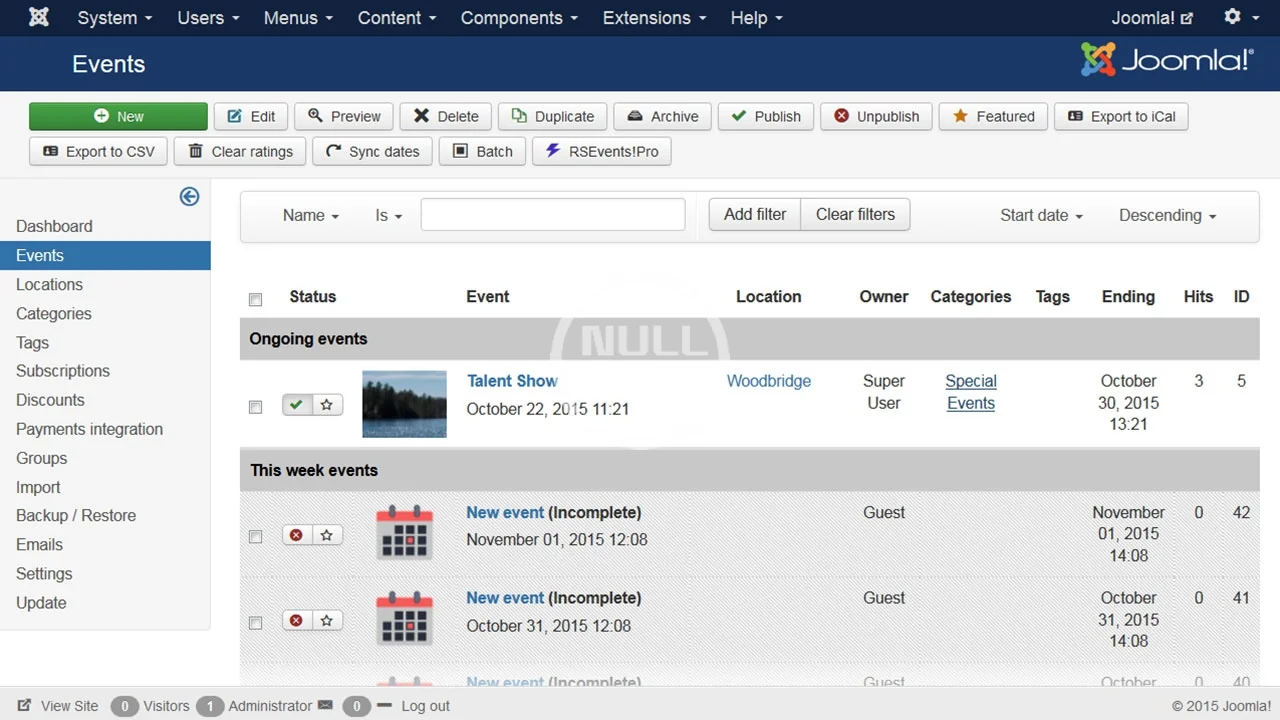 RSEvents!Pro melhora ainda mais o gerenciamento de eventos do Joomla! e vem com soluções embutidas para todos os aspectos relacionados ao gerenciamento de eventos, como visibilidade, compartilhamento social e comunicação, registro de eventos, otimização SEO e,自然地,当然还包括支付。RSEvents!Pro foi projetado para ser o mais fácil e intuitivo possível, mas com todas as funcionalidades que você pode precisar ao gerenciar eventos em seu website Joomla! 3.x.