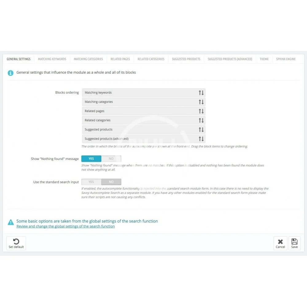 Please note that Savvy Search Autocomplete is a module that provides a convenient interface with an autocomplete functionality but by default it relies on the PrestaShop search algorithms and it was not designed to enhance search relevancy or search speed. The mentioned improvements can be achieved with the help of other specialized modules including the Elastic Jet Search that is produced by our team.