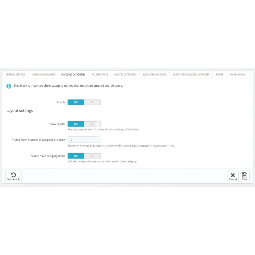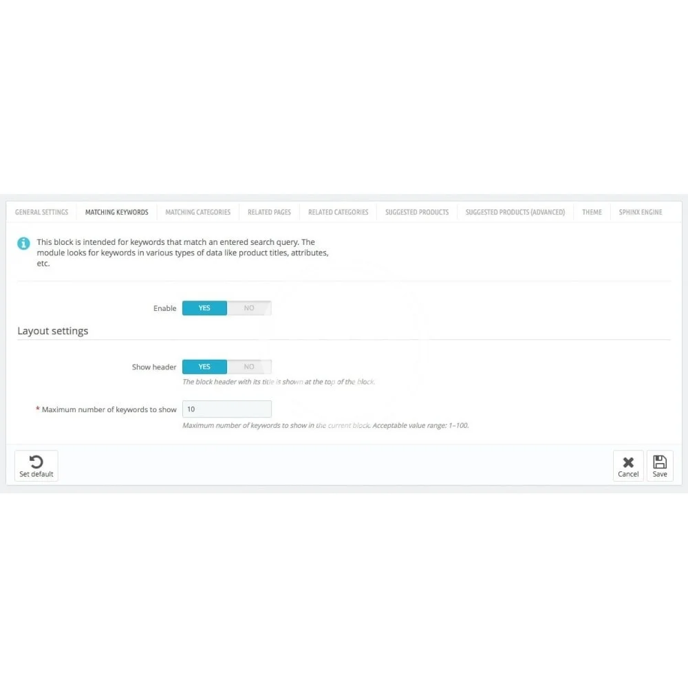 The control panel of the module provides plenty of settings to manage every aspect of its functionality and look. There are settings related to shown data, module layout, search algorithms, etc.