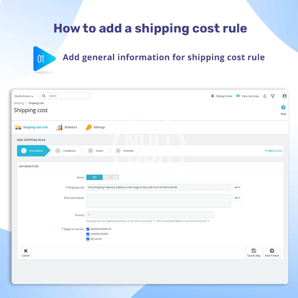 - Create as many shipping cost rules as you want and set up common information for them such as shipping rule's name, description, priority, or carriers to apply.