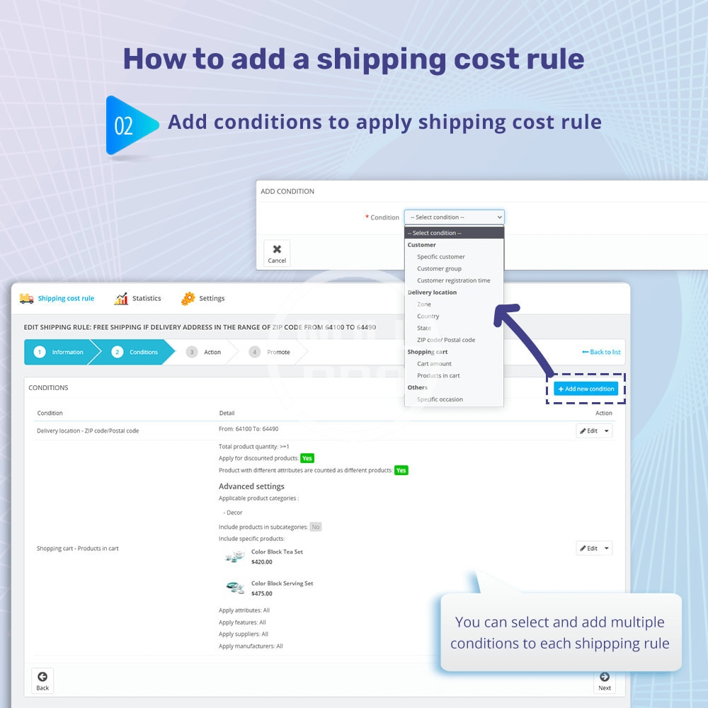 Create shipping cost rules by zone, country, zip code, customer group, size, weight, time periods, etc. Calculate shipping costs flexibly to encourage customers to buy more!