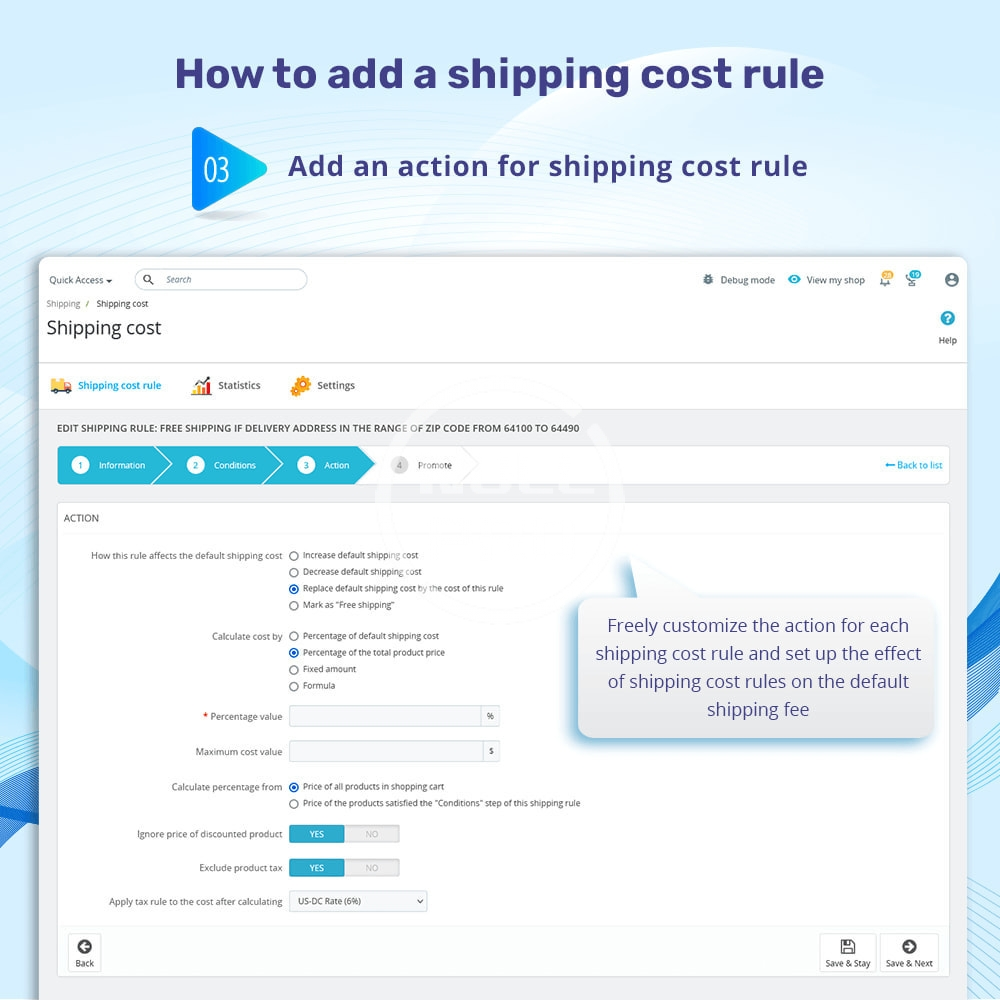 - Freely customize the action for each shipping cost rule and set up the effect of shipping cost rules on the default shipping fee: