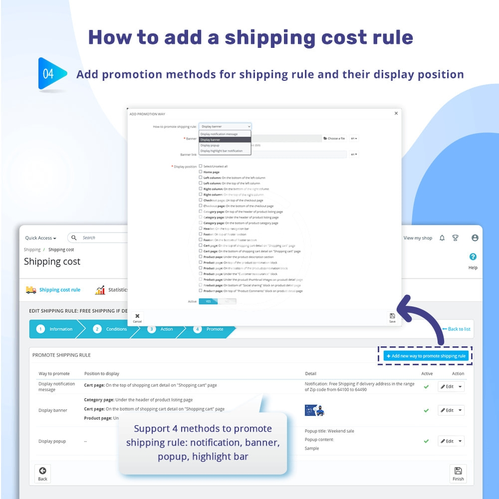 - Choose ways to promote shipping cost rules and customize the content displayed: display banner, popup, highlight bar notification, or notification message.