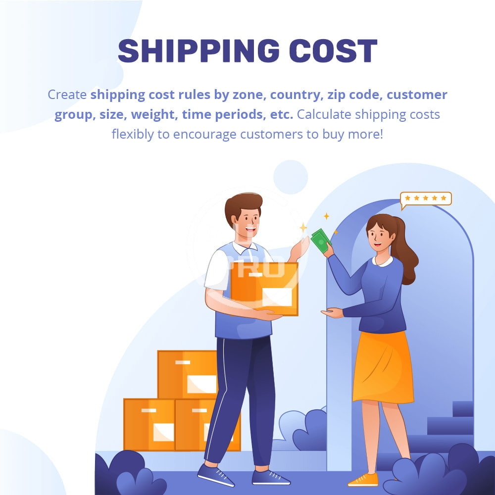 - Create shipping cost rules by zone, country, zip code, customer group, size, weight, time periods, e