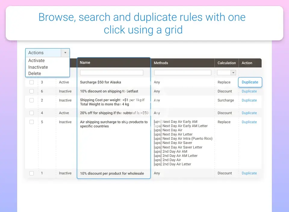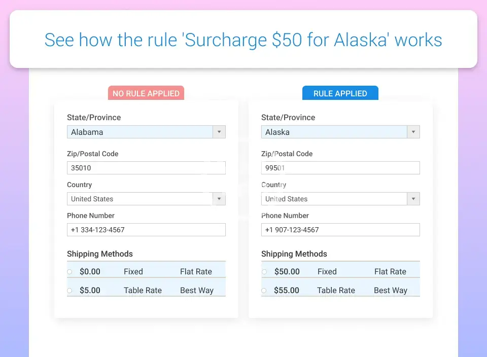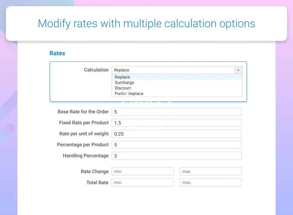 Create custom shipping rules based on a variety of product conditions and shopping cart attributes. Apply additional delivery options surcharge, discount or replace rates according to your business needs.