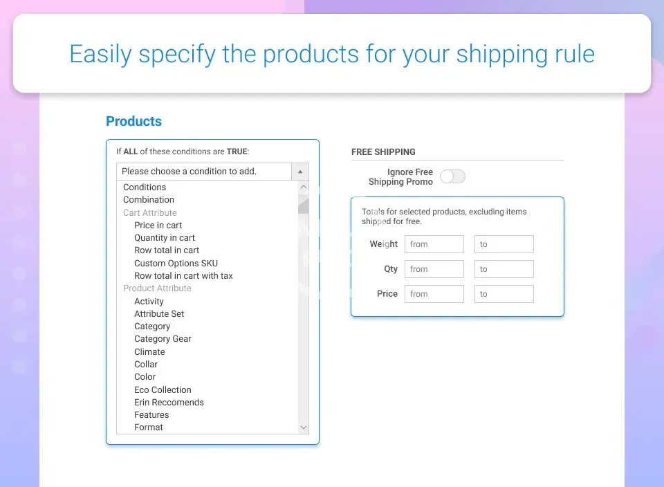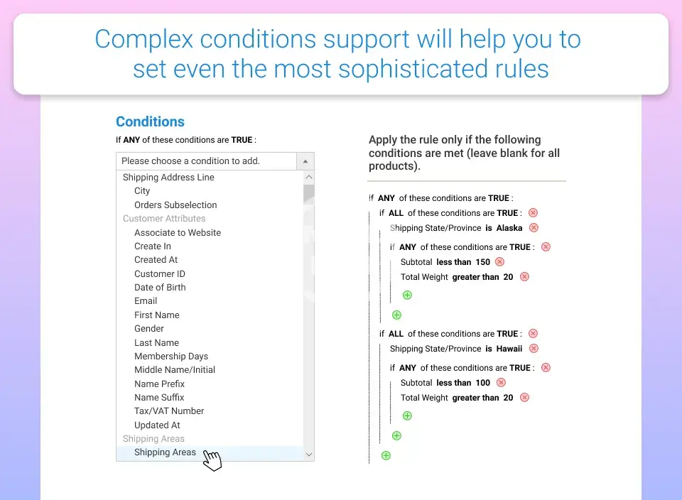 - Create custom shipping rules based on a variety of product conditions and shopping cart attributes.