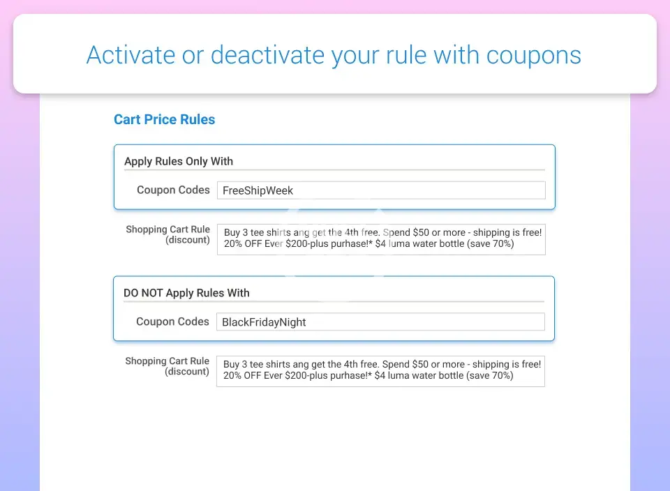 - Preset a coupon code, and the rule will be applied ONLY with this coupon;