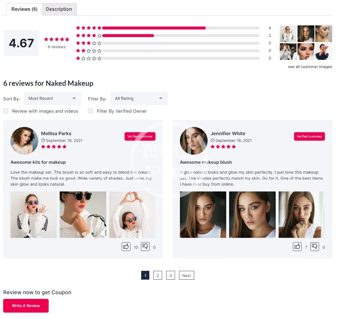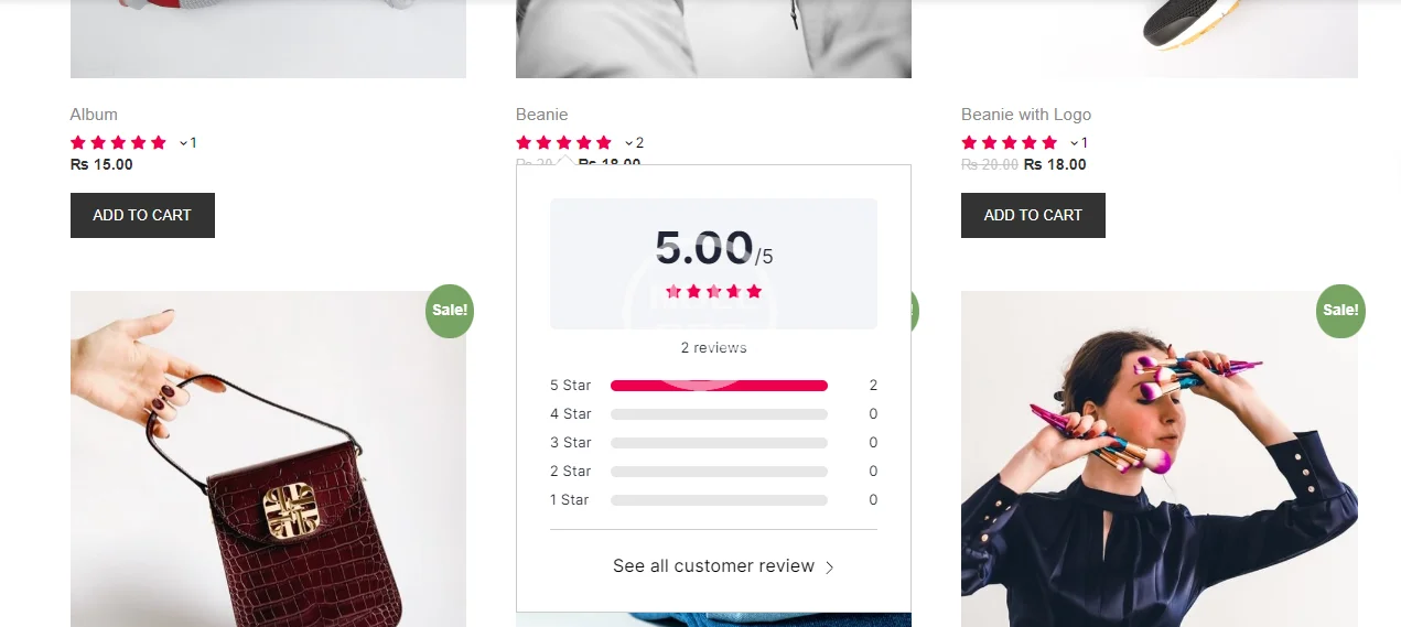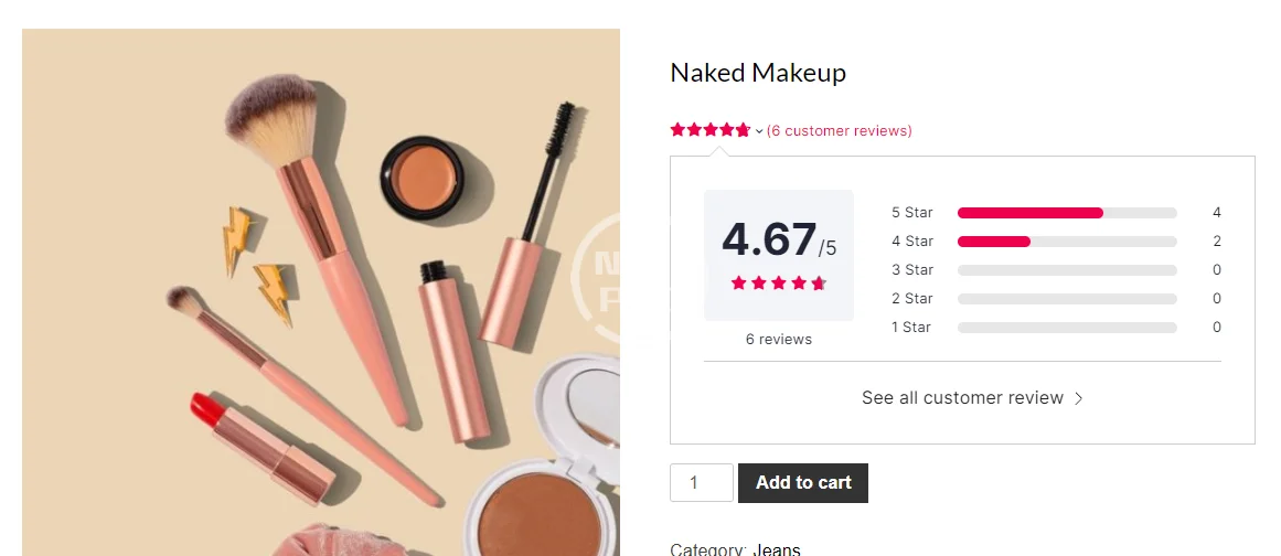 - Review summary bar with all customer images list.The plugin offers a unique way of displaying review bar along with the images uploaded by the customers. The corresponding review can also be seen from the review bar when these images are opened in the lightbox.