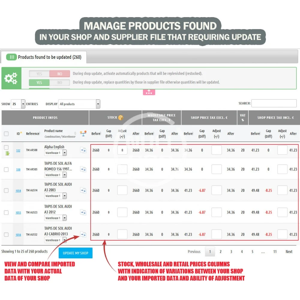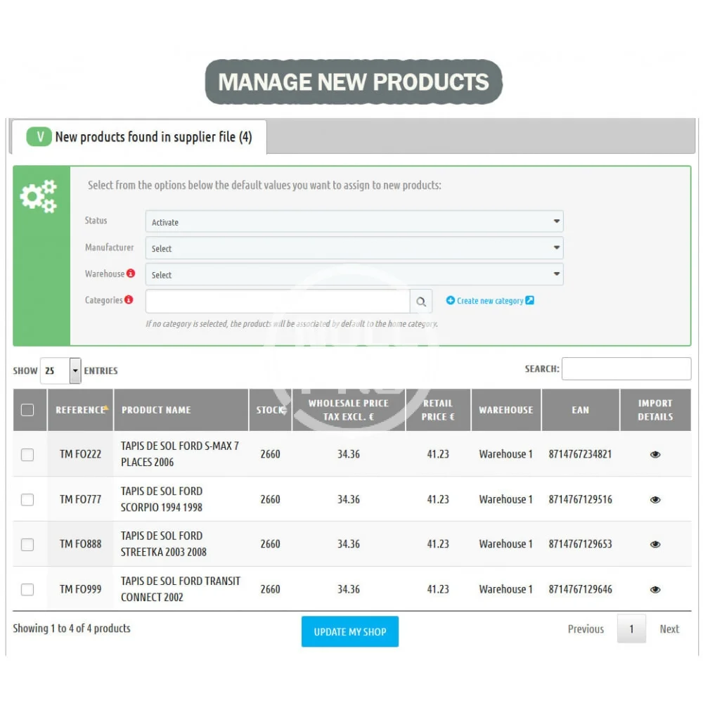 This module allows you to facilitate, accelerate and simplify bulk stock and prices update of your store by processing suppliers files import.