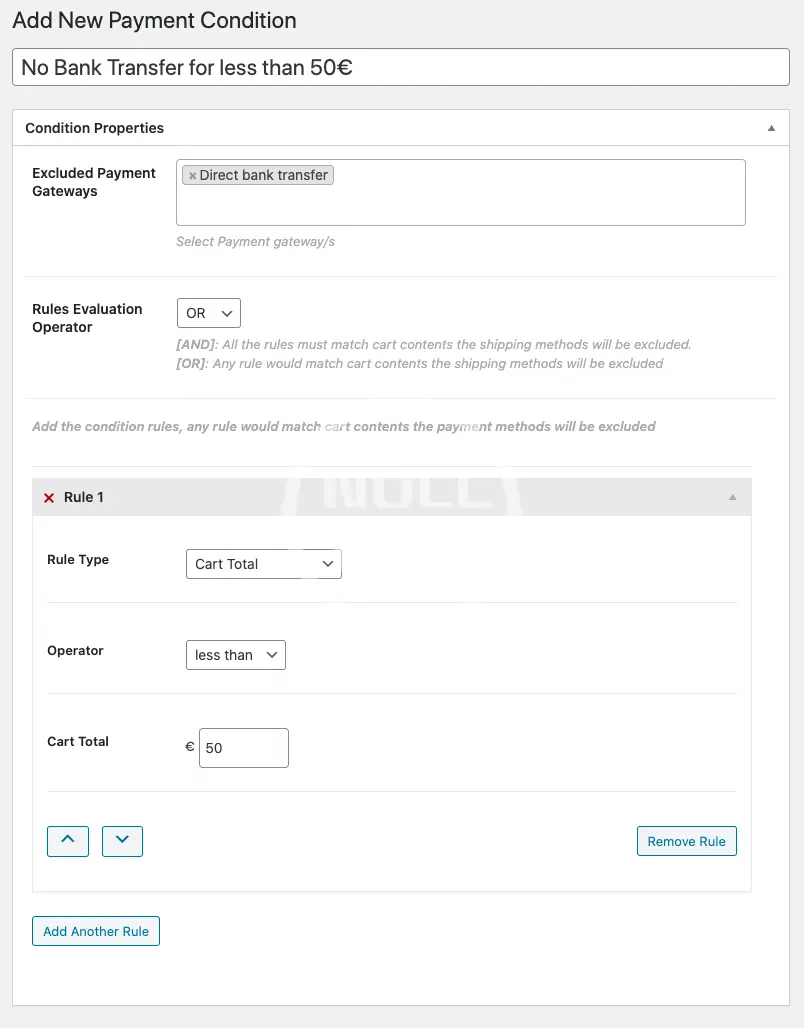 You can take full control of your store payment gateways by excluding certain gateways if certain rules were met in the checkout process. For example, you can exclude Check Payments if the cart total is less than 100$. You can add an unlimited number of rules to control your payment methods availability.