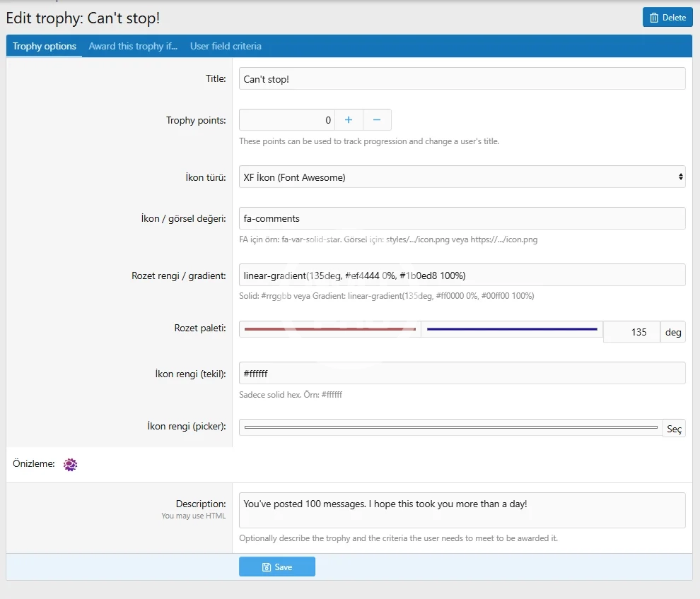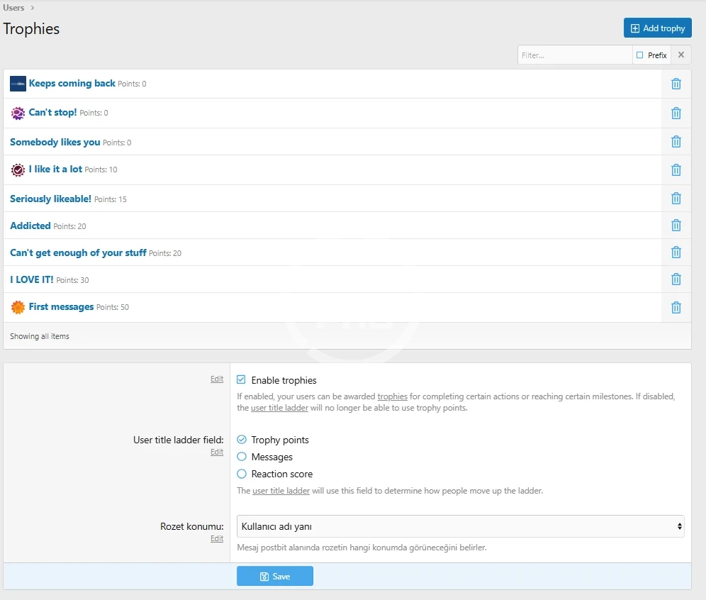 You can define trophies automatically or manually based on users’ behavior on the forum.