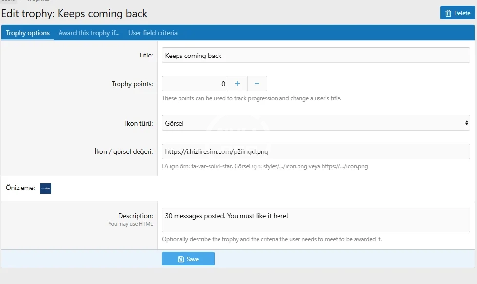 You can add new trophies or edit existing ones via the Admin Panel.